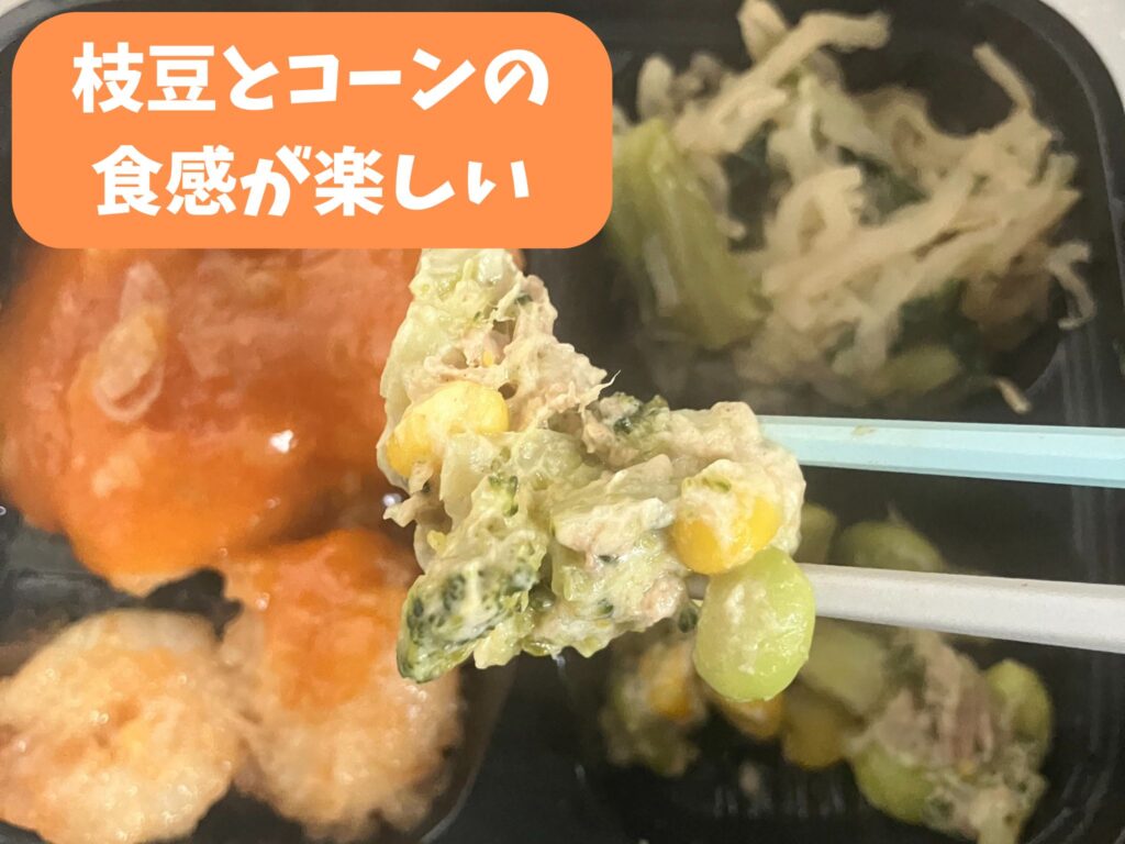 ブロッコリー・枝豆・コーンのツナ和えは、マヨネーズ味で美味しかったです。